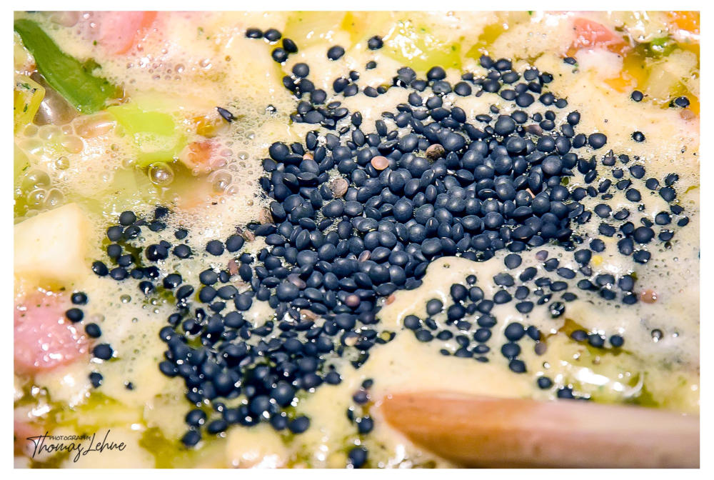 Tassen Beluga-Linsen hinzugeben. Alles mindestens 35 min. köcheln lassen, danach die in
