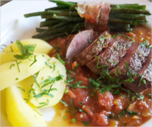 MIT GRÜNEN BOHNEN & BACONMANTEL UND FRUCHTIGER TOMATEN-SAUCE
