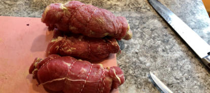 zusammenrollen und mit einem Faden umwicken und verknoten.